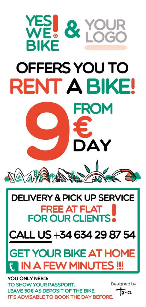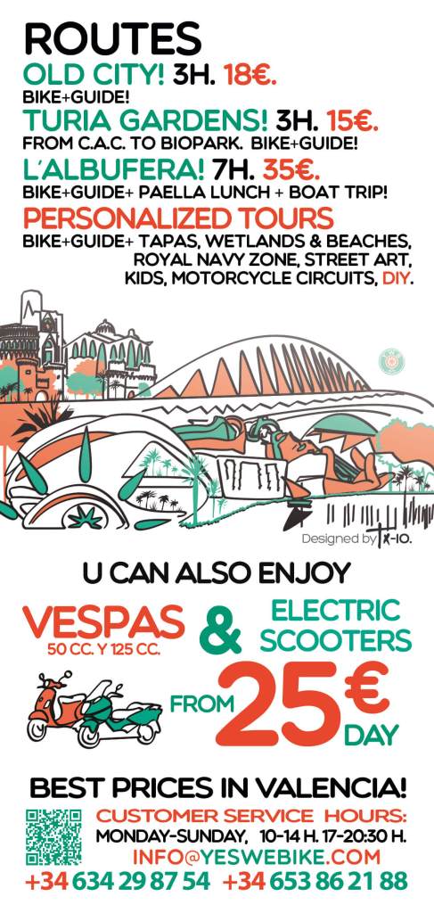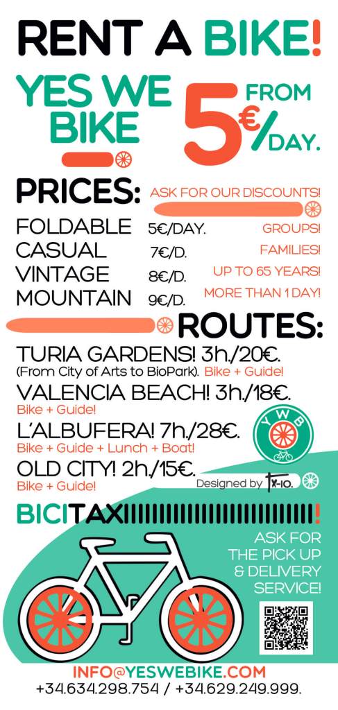 Ejemplo de uno de los flyers con los nuevos modelos de bicicletas y las rutas turísticas por la ciudad de Valencia. Example of one of the flyers with the new bicycle models and the tourist routes through the city of Valencia.