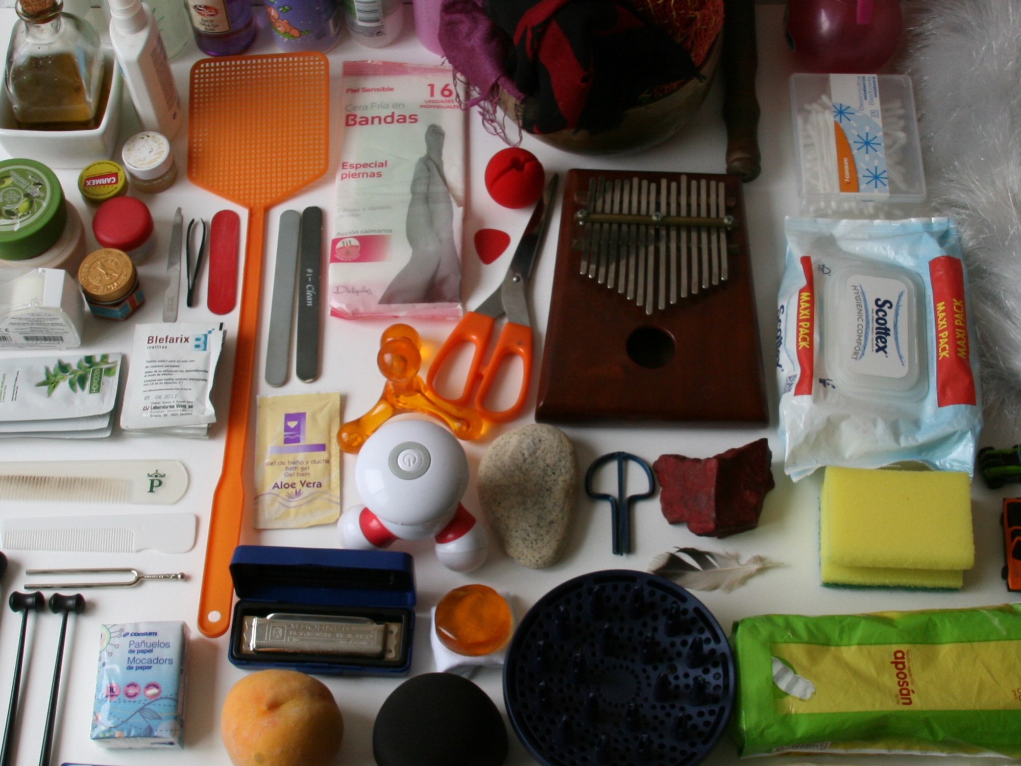 Fotografía de algunos de los diversos objetos usados en los masajes sonorohápticos / Photograph of some of the objects used in the massages. Autora: Rocío SILLERAS.